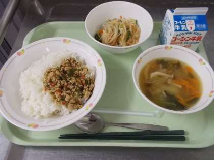 今月の給食目標は「時間を守って食べましょう」です。給食は、12時15分から13時5分までの間に、準備、食事、片付け、はみがきを済ませます。どの時間も充分とれるよう、みんなで協力しましょう。