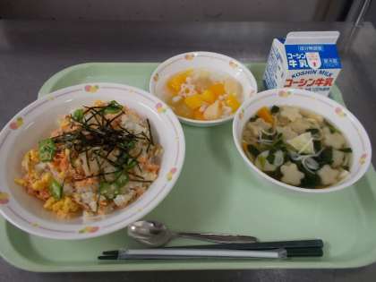 今週の日曜日は七夕です。これにちなんで七夕集会があったので、今日は七夕の行事食である「そうめん」を入れた献立です。七夕には笹に願い事を書いた短冊をかけたり、「そうめん」を食べて麦の収穫を祝い、1年間病気にならず元気に過ごせるよう願う風習があります。
