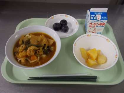 明日から4年生の皆さんが山梨県の山中湖へ移動教室にいきます。これにちなんで、今日は山梨県の郷土料理「ほうとう」です。「ほうとう」は小麦粉で作った幅広の麺とかぼちゃを初めとしたたっぷりの野菜をみそ味のつゆで煮込んだ郷土料理です。デザートは山梨県の名産品のひとつ「ぶどう」です。