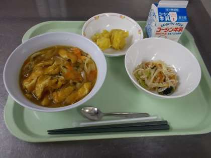 今日の野菜に和えてあるポン酢は給食室で手作りしています。しょうゆ、砂糖、酢、レモン汁を煮て作りました。ポン酢は必ず柑橘類の果汁を入れるので、ゆずやかぼす、すだちなど、旬に合わせて色々な種類のポン酢を作ることができます。