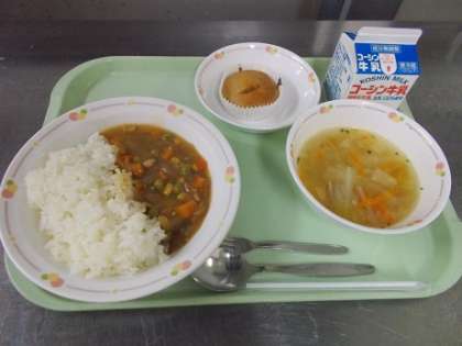 今日の給食は世界ともだちプロジェクト5か国の内の一つ、ミクロネシア連邦の料理です。「チキンアドボ」はしょうゆと酢で味付けした鶏の煮込みです。「バナナブレッド」はパンではなく、ケーキのようなお菓子です。バナナたっぷりでほんのり甘く、ちょっともっちりしています。