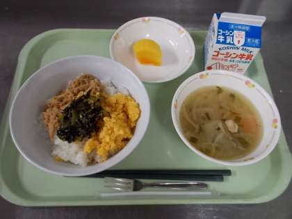 今日から一週間は、和食の中心となるお米と、だしを味わう給食が登場します。今日のお米は「岩手県産ひとめぼれ」です。さっぱりとしたおいしさが特徴なので、丼にしました。汁物のだしはかつお節でとったかつおだしです。しょうゆ仕立ての汁なので、風味も味わってください。