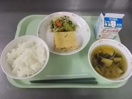 今日のお米は北海道産「ふっくりんこ」です。粒がふっくらしておいしそうなイメージから「ふっくりんこ」という名前になりました。だしは昆布とかつお節の「合わせ出汁」です。汁物は中の具によっても味が変わります。同じだしと味付けですが、一昨日のはっと汁とは違った味になりました。