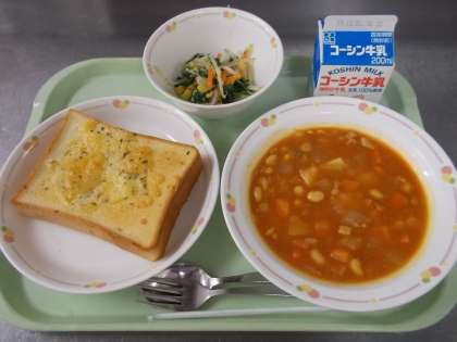 今日のチーズトーストはにんにくバターをぬったパンの上に、チーズとパセリをのせて焼きました。上にのっている「チーズ」はたんぱく質やカルシウムなど、体をつくるもとになる栄養素がたっぷり含まれています。しっかり食べましょう。