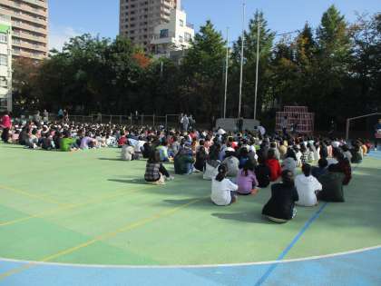 学校内で火災が発生したことを想定して、速やかに校庭に移動しました。訓練用の火災ブザーが鳴ってから5分以内で全校児童の避難を確認しました。