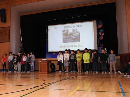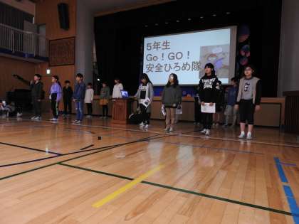 今回の集会では、地域の安全を見守ってくださるパトロールの皆さんをお招きして、5年生が「Go!Go!安全ひろめ隊」・3年生が「地域・あんぜんマップ」を発表しました。