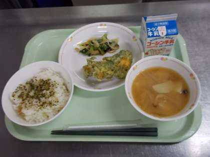 今日のふりかけに入っている「しらす」には、骨や歯をつくるもとになるカルシウムがたっぷり含まれています。成長期のみなさんに食べてほしい食品のひとつなので、サラダのトッピング、かき揚げの具など、色々な食べ方で登場します。