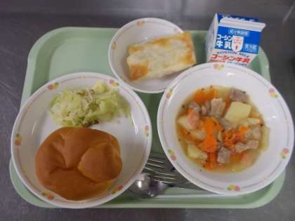 今日は世界ともだちプロジェクト5か国のうち、オーストリアの献立です。海がない国で、肉料理が多く、地方ごとの郷土料理があります。今日はシュタイヤマルク州のポトフ、チロル州のサラダ、りんごを使ったオーストリアの郷土菓子「アプフェルシュトゥルーデル」を出します。