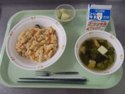 今日は「立春」です。冬と春の分かれめだった節分の次の日なので、春の始まりになります。そこで、今日の献立は春をイメージした蕗を入れたおこわと、菜の花を入れたすまし汁と、よもぎを入れたお団子を組み合わせた「立春給食」です。