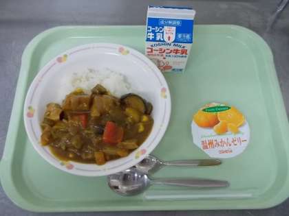 (夏野菜カレーに入っている夏野菜は「トマト」「ピーマン」「なす」「かぼちゃ」「おくら」「とうもろこし」でした。)
