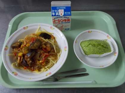 2学期が始まりました。夏休みは元気に過ごせましたか?まだまだ暑い日が続くので、今日は体の調子を整えるビタミンとミネラルがたっぷりの献立です。スパゲティにはトマトやなす、ピーマンなどの夏野菜、ケーキには鉄とカルシウムを含むこまつなが入っています。