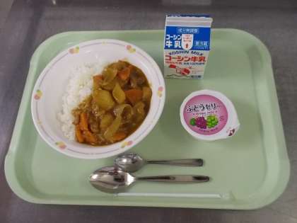 朋有小学校のカレーライスは、小麦粉と油をじっくり炒めて手作りしたルウに、カレー粉と6種類のスパイスを使い、最後に少しだけはちみつを入れてつくります。朋有小学校のオリジナルチキンカレーです。