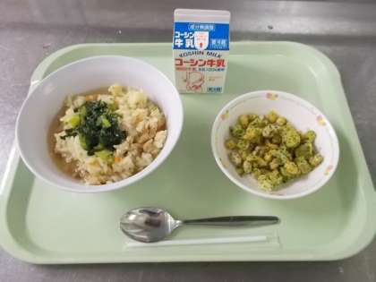 今日のスープチャーハンは、日本のお茶漬けや、韓国のクッパのような料理です。具だくさんのチャーハンに小松菜のスープをかけて食べます。さらさらと食べやすい反面、食事はよく噛んで食べることも大切なので、噛み応えがある大豆を使ったあおのりビーンズポテトを合わせました。