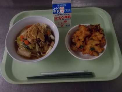 こぎつねうどんは刻んだ油揚げをいれたうどんです。油揚げは薄切りにした豆腐を揚げてつくる食品で、体をつくるもとになるたんぱく質や、骨や歯を作るもとになるカルシウムを含んでいます。味を良く含み、旨味もあるので、うどん以外に汁物や煮物にもよく使っています。