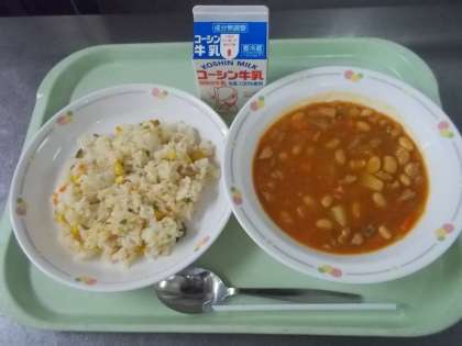 今日のおかず「ポークビーンズ」は、豆類と豚肉、トマトなどの野菜をたっぷり入れて煮込んだアメリカの家庭料理です。給食では大豆で作りますが、アメリカでは白いんげん豆という豆で作ることが多い料理です。