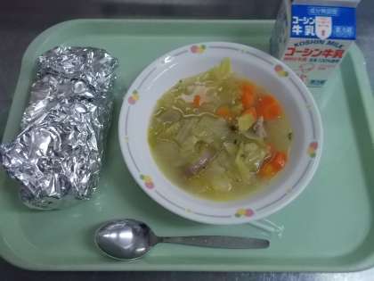 今日の「ビーンズドッグ」は、細かく刻んだ豚肉と大豆、野菜で作ったミートソースと、チーズをパンにはさんで焼いた料理です。体が温まるよう、チリパウダーという辛味を感じる香辛料を少し入れてあります。野菜たっぷりのポトフも食べて、元気な体をつくりましょう。