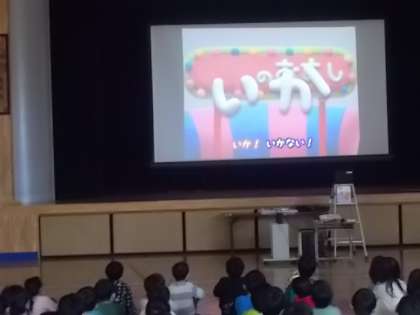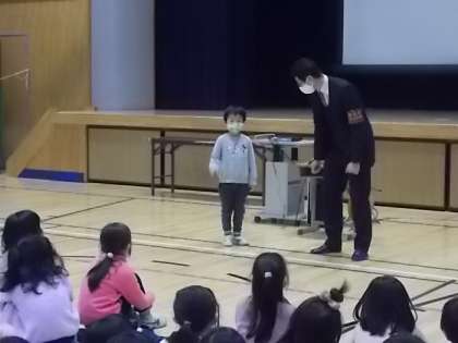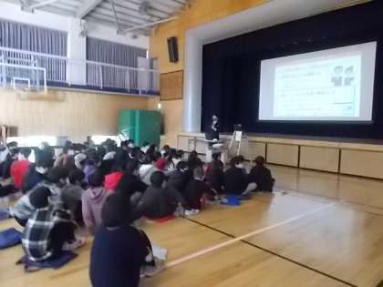 1.6年が体育館、他学年は各教室にてオンラインで授業をしました。