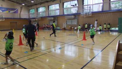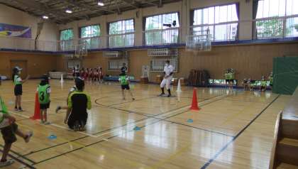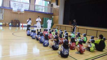 読売巨人軍の方々による野球教室が行われました。雨のため体育館での開催になりました。体が大きく、かっこいいユニフォームを着た選手に目をキラキラさせて話を聞く子供たち。選手の遠投には、驚きと感動の歓声があがりました。ボールを投げあうミニゲームも楽しみました。特別講師による貴重な時間を過ごすことができました。