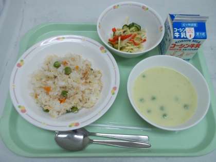 5月のブックメニューは『大研究!!「豆」のひみつがわかる本3』巻より、グリンピースのポタージュです。春に旬をむかえるグリンピースは、皮が薄く、旨味が詰まっています。苦手な人もまずは一口、食べてみてください。今日はピラフにも入れました。