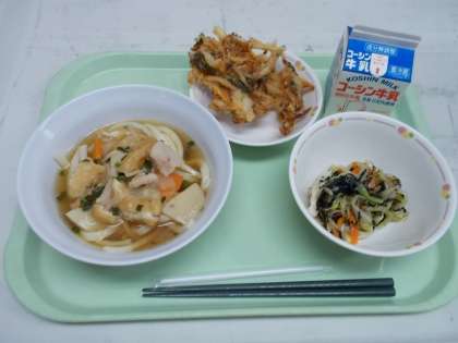今日のかき揚げは、そのまま食べても、うどんにのせて食べることもできるよう、タレではなく塩で味付けしてあります。かき揚げには、東京都の八丈島でとれた明日葉が入っています。明日葉には、丈夫な骨を作るのを助けるビタミンKという栄養素が含まれています。