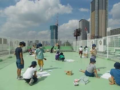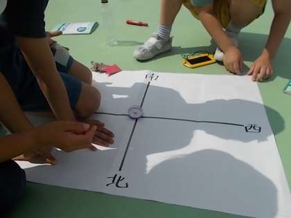 屋上にでて影の動きを記録しています。コンパスを使って東西南北をきちんと合わせます。どんな動きをしたのでしょうか?