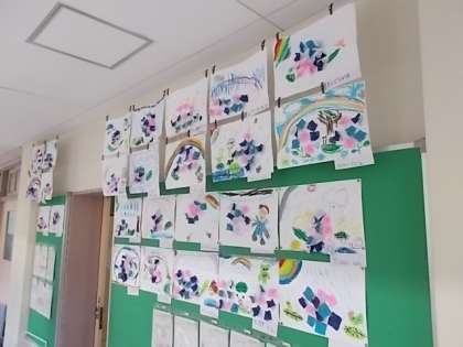 1年生の廊下には児童が描いたあじさいが綺麗に咲いています。雨上がりの虹や、カタツムリ、カエルなどが描かれていて、梅雨のうっとうしさを吹き飛ばすほどの明るい作品が並んでいます。