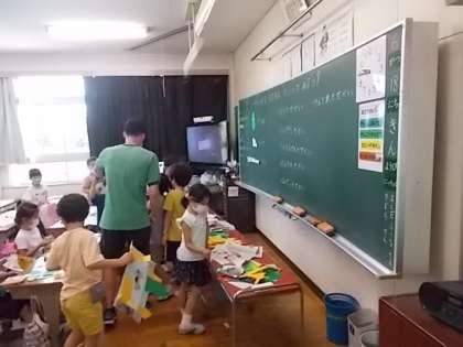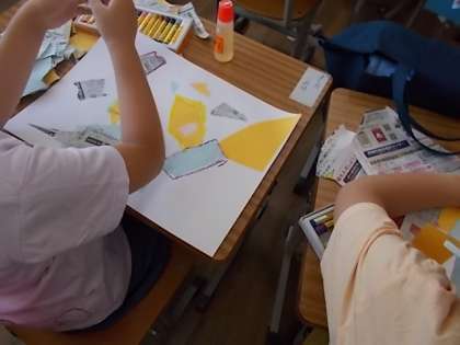 図工の時間では、次の作品「やぶれた かたちから うまれたよ」に取り掛かっていて、色紙や、新聞紙をやぶって、貼り付けて、クレヨンで一生懸命に描いています。どんな作品が仕上がるのか楽しみにしていてください。