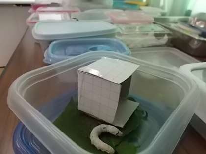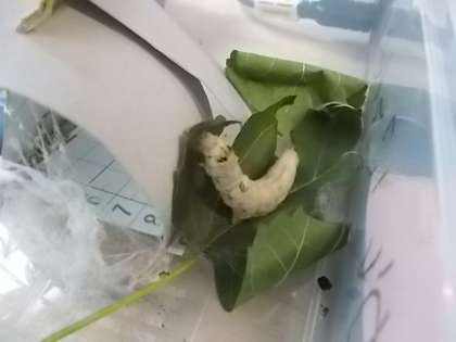 総合の授業で「かいこのひみつ」を学習しました。3年生は2人で1匹のかいこを育てています。週末にはお家に持ち帰って、お世話をしてくれています。ご家庭のご協力にも感謝いたします。写真は1週間前、教室で撮影しました。クワの葉をたくさん食べてくねくねと活発に動いていました。