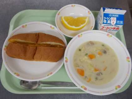 今日のデザート「河内晩柑」は愛媛県産の果物です。果汁がたっぷりで、とても良い香りがします。白い薄皮はそのまま食べられますが、気になる人は手でむいて、黄色い中身だけ食べてみてください。