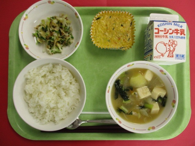 今日の給食は、たまごの唐草焼きを作りました。唐草焼きは、ひじきや豆腐、肉などを使い、卵の中に具がたくさん入っている様子が唐草模様に見えることからこの名前が付きました。卵焼きに豆腐が入ることで、ふわふわとした食感になり、子供たちに好評でした。