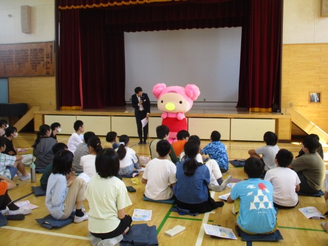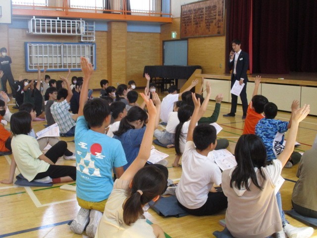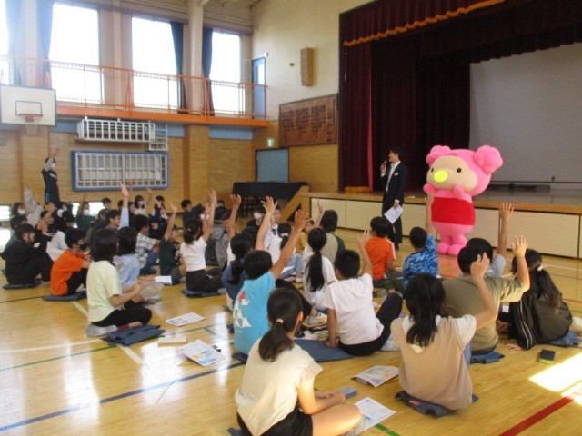 9月24日(水)の3時間目に、明治安田生命の方に来ていただき、お金の使い方などについて教えていただきました。マスコットキャラクターも登場し、楽しみながら学ぶことができました。