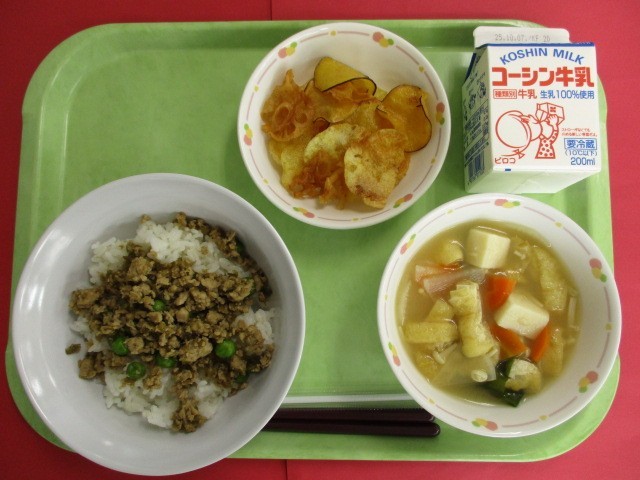 今日は、6年2組と3年1組のリクエスト給食で、「野菜チップス」を提供しました。野菜チップスは、3種類の根菜を油でカリッと揚げています。パリパリとした食感が子供たちに好評です。また、今日のそぼろ丼には、東京都産のなすを使いました。なすを小さく切ることで、苦手な子もおいしく食べられるように工夫をしました。