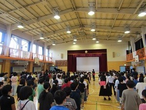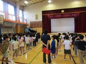 10月2日(木)に音楽朝会を行いました。今回は全校で「ビリーヴ」を合唱しました。「すてきな未来がつづいていくように」という思いを込め、美しく響きのある声で歌いました。