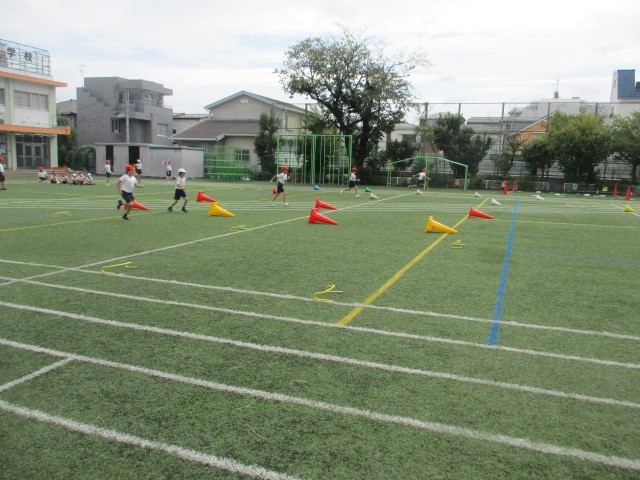 10月7日(火)、4年生が校庭でミニハードルやコーンを置き、コースを作って学習していました。