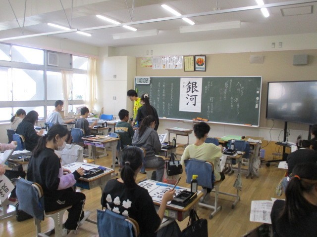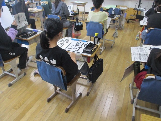 「銀河」という文字を筆で書きます。筆遣いのポイントを確認し、その部分を意識して練習していました。
