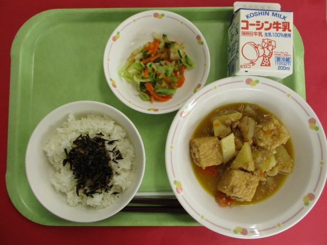 今日の給食は、生揚げをたっぷり使った味噌煮を作りました。生揚げは、大豆を加工した食材で、食物繊維やタンパク質、鉄分が豊富に含まれています。成長期の子供には、欠かせない栄養がギュッと詰まっています。子供たちが食べやすいように、みそ味にしたことで、ご飯も進み完食している子も多くいました。