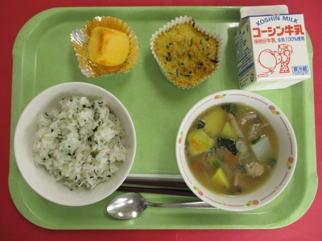 今日の給食では、今が旬の柿を提供しました。柿は、ビタミンが豊富に含まれており、風邪を予防してくれる働きがあります。