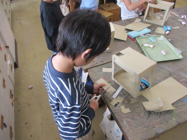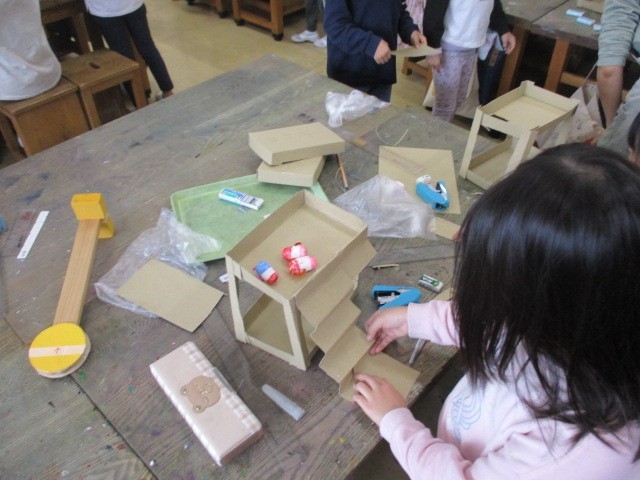 2年生が図工室で段ボール等を使って、工作をしていました。