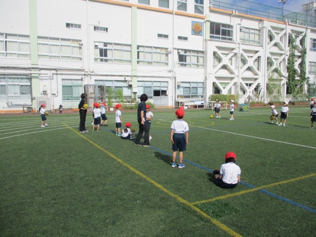 10月30日(木)、校庭で1年生が体育の学習をしています。