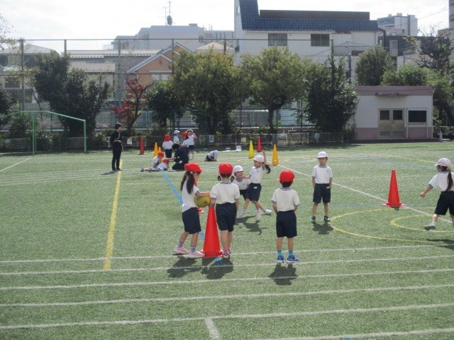 ボールを使った運動遊びで、お互いにボール投げの練習をしたり、的あてゲームをしたりと