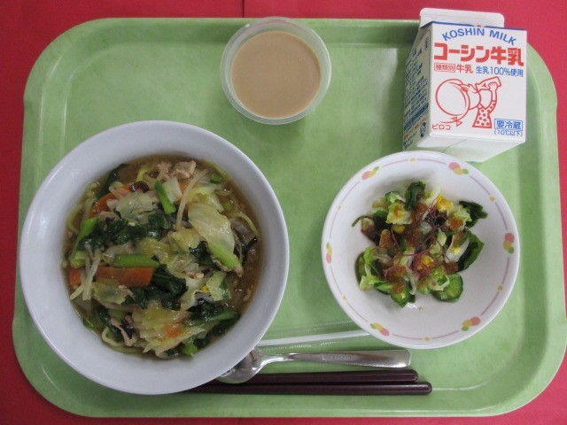 今日の給食は、子供たちに人気のラーメンを提供しました。朝日小学校のラーメンは、スープを一から作っており、肉や野菜のうまみがギュッと詰まっています。野菜をたっぷり使いましたが、抵抗感なく食べている様子を見ることができました。また、デザートには、牛乳をたっぷり使ったカフェオレゼリーを作りました。牛乳には、骨を作るために必要なカルシウムや、免疫力を高めてくれるビタミンやミネラルが豊富に含まれています。
