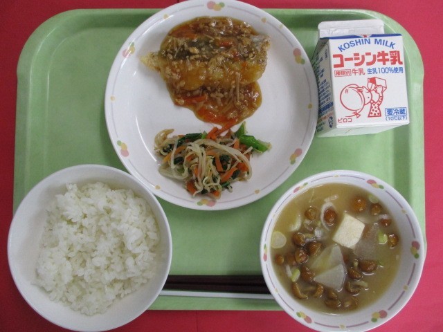今日の給食は、秋の味覚の1つきのこを使った「なめこ汁」を作りました。なめこのぬめりには、免疫力を上げてくれたり、のどや胃の粘膜を守ってくれたりする働きがあります。また、きのこには、食物繊維が豊富に含まれており、腸内環境を整える働きもあります。