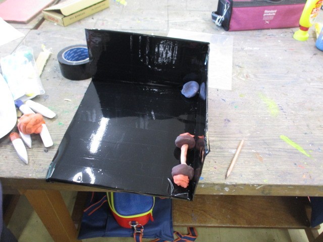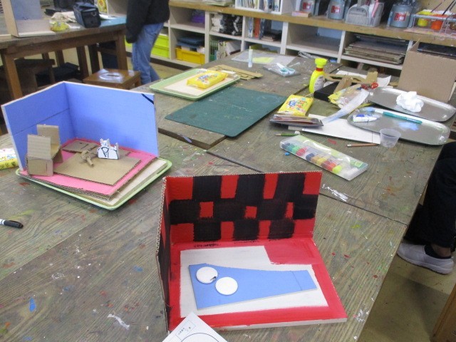 お店にある家具を木や針金、段ボール等の使い方を工夫しながら、お店を表現するのだそうです。制作が始まった段階で、これからどのようなお店なのかが分かってくると思います。真ん中のお部屋は、スポーツジムでしょうか?