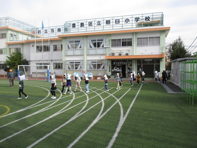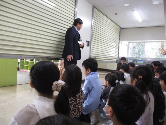 1年生は訓練後、第一昇降口の防火シャッター前で、防火シャッターが作動している場合の行動について、学習しました。防火シャッターの作動中は、シャッターの下は通らず、その脇にある扉から避難することを分かっているようでした。どの児童も意欲的に正しい行動について発言していました。