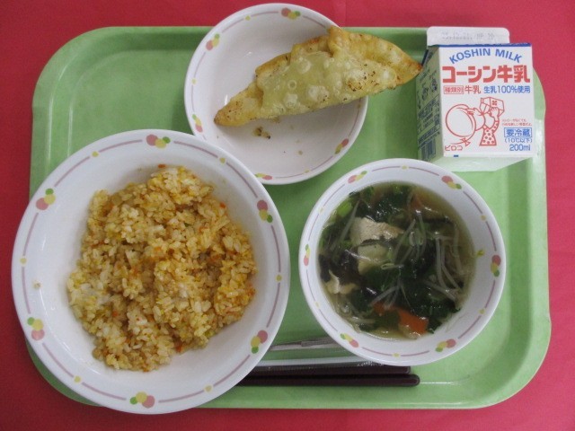今日の給食は、人気メニューの1つである「ジャンボ餃子」を提供しました。餃子は、油で揚げた揚げ餃子にしました。皮はカリカリで、肉汁たっぷりになるよう工夫して調理しました。子供たちは、嬉しそうな笑顔を浮かべて、食べていました。