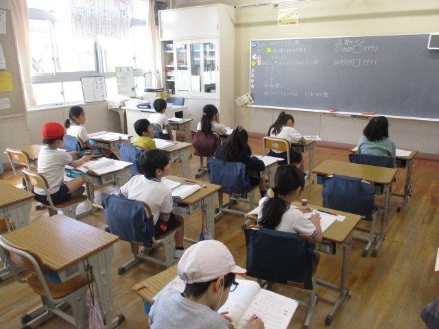 数の大小、一番小さい数の選択、数直線の読み取りなど、多様な問題があります。数直線の問題では、どんな数のまとまりでめもりが表されているかを判別しなければなりません。大型提示装置の画面や教科書のめもりをじっくり見て考えていました。