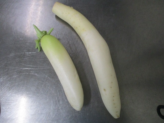 今日の給食は、地場産物である東京野菜を使った献立を提供しました。食材の一つに江戸東京野菜の「練馬大根」を使いました。練馬大根は、青首大根と比べ、細長く、収穫するのが大変な野菜と言われています。東京都では、たくさんの種類の野菜・果物が育てられていることを感じてもらえるような機会になればよいと考えています。