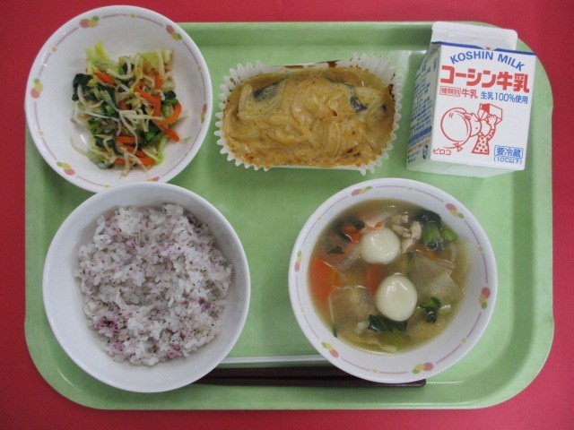 1月11日(日)が、鏡開きということで、一足早く鏡開き献立を提供しました。鏡開きとは、お正月に年神様(穀物の神様)が滞在していた鏡餅を食べ、霊力を分けてもらい、1年の良運を願う行事です。もちもちの団子を入れた雑煮は、子供たちに好評で、おいしく食べていました。給食を通じて、日本の食文化について学んでもらいました。