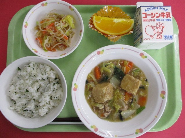 今日の給食は、今が旬のネーブルオレンジを提供しました。ネーブルオレンジは、酸味と甘みのバランスが良く、香りが強いのが特徴です。また、「ネーブル」という言葉は、「おへそ」という意味があり、オレンジの下のほうがへそのように、窪んでいることからこの名前が付きました。柑橘類には、風邪予防に効果的なビタミンCが豊富に含まれています。まだまだ寒い日が続くので、積極的に摂取していきたいですね。