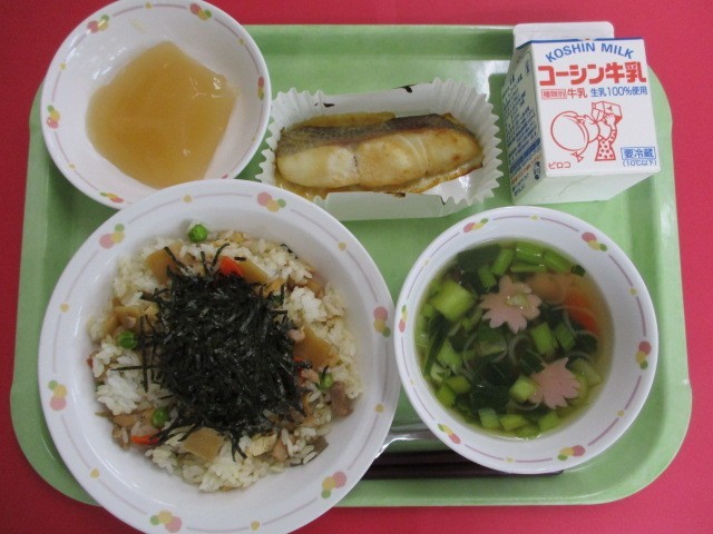 今日の給食は、桃の節句献立を提供しました。桃の節句は別名ひな祭りと呼ばれています。桃の節句は名前の通り、桃の花を飾ります。桃の花には、邪気を払い不老長寿をもたらす縁起物だと考えられています。給食では、子供たちの健康を願って、ももの果汁を使ったももゼリーを提供しました。